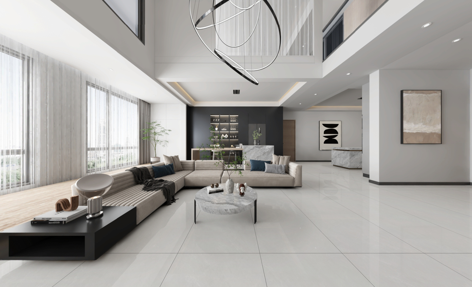 3米层高和1.5米砖高比例,与用纯粹简单的几何设计,融合艺术空间的铺贴法则,:砖体本身的比例完美契合!